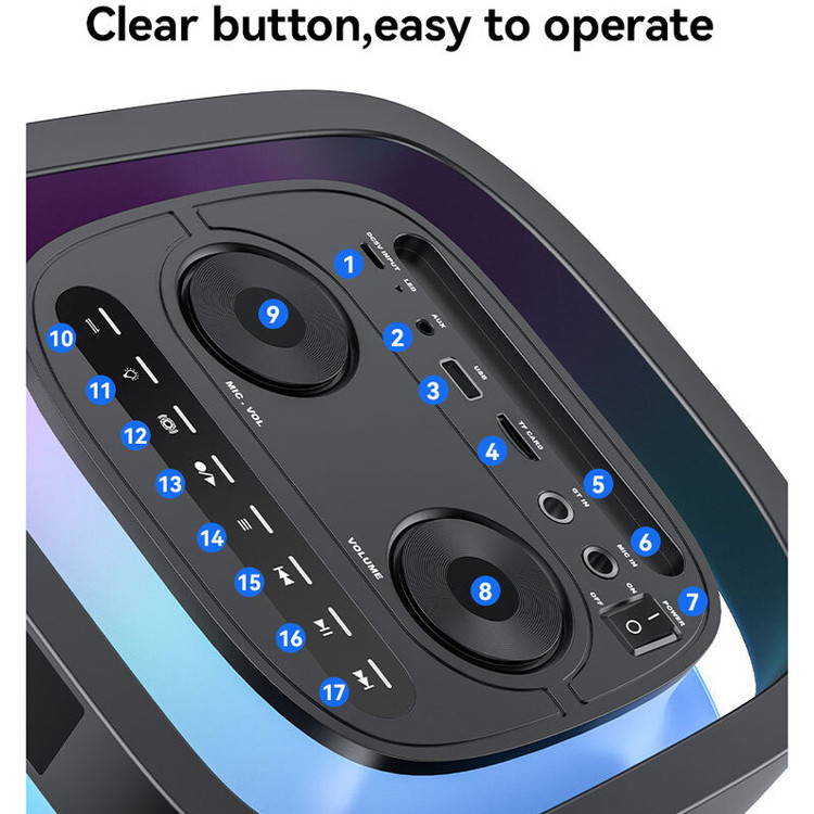 کلیدهای فیزیکی تعبیه شده جهت مدیریت موسیقی، تنظیم صدا، Mode و ...، مجهز به 1 عدد پورت ورودی میکروفون و 1 عدد پورت گیتار